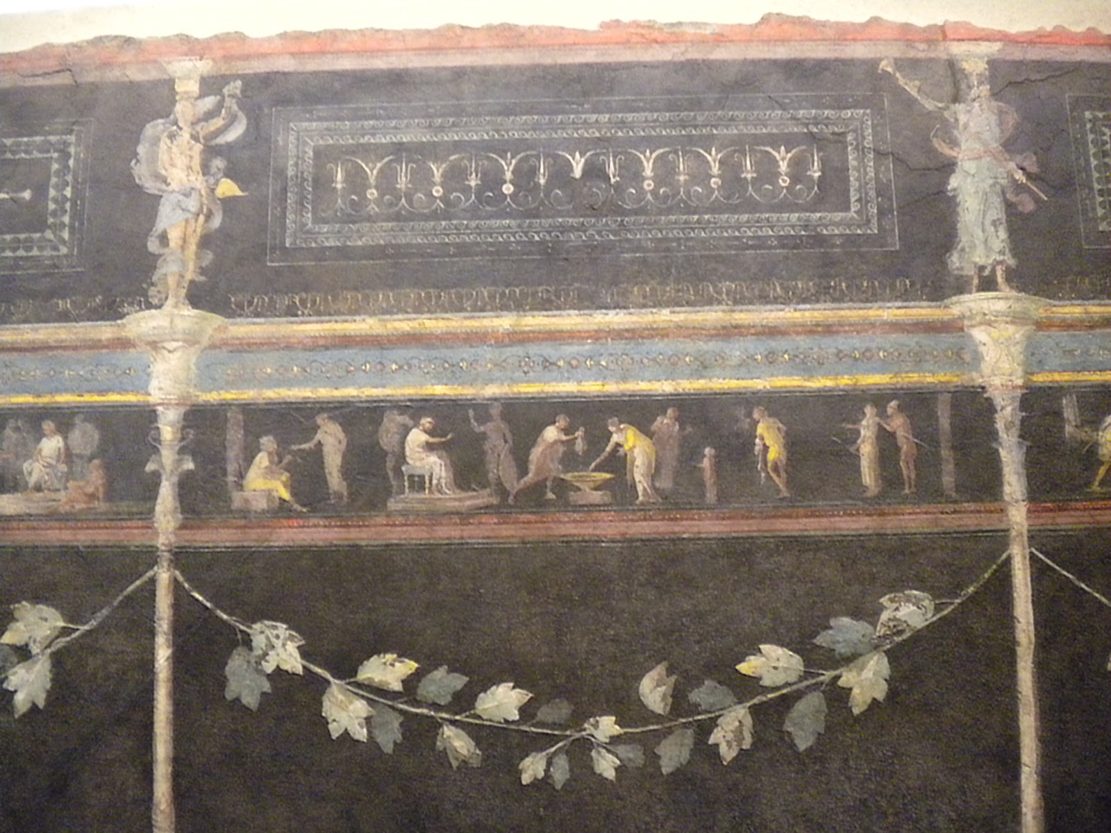 This is the Villa Farnese exhibit. The frescoes are yellow, blue and red on a black background. We weren't allowed to use a flash so these pictures don't depict the saturated colors.